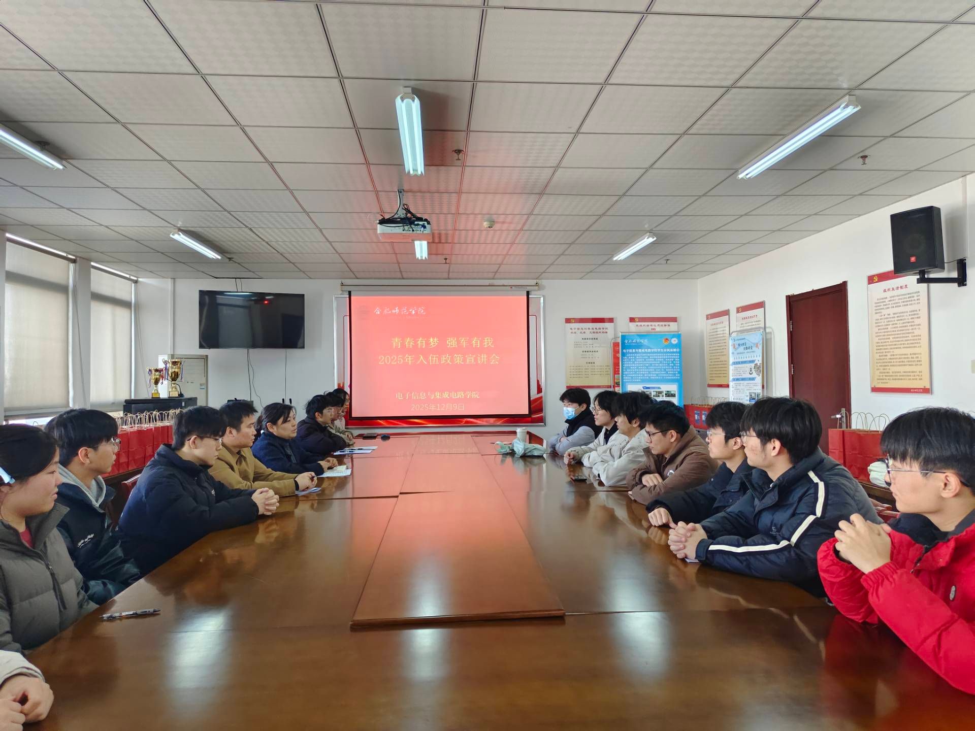 为深入贯彻国家征兵政策,扎实推进国防教育,激发青年学子投身军营、报效祖国的热情,2025年12月9日,电子信息与集成电路学院在锦绣校区组织召开“青春有梦 强军有我”2026届毕业生应征入伍政策宣讲会。学院党委副书记、毕业班辅导员及有志参军的毕业生齐聚现场,共话军旅理想。