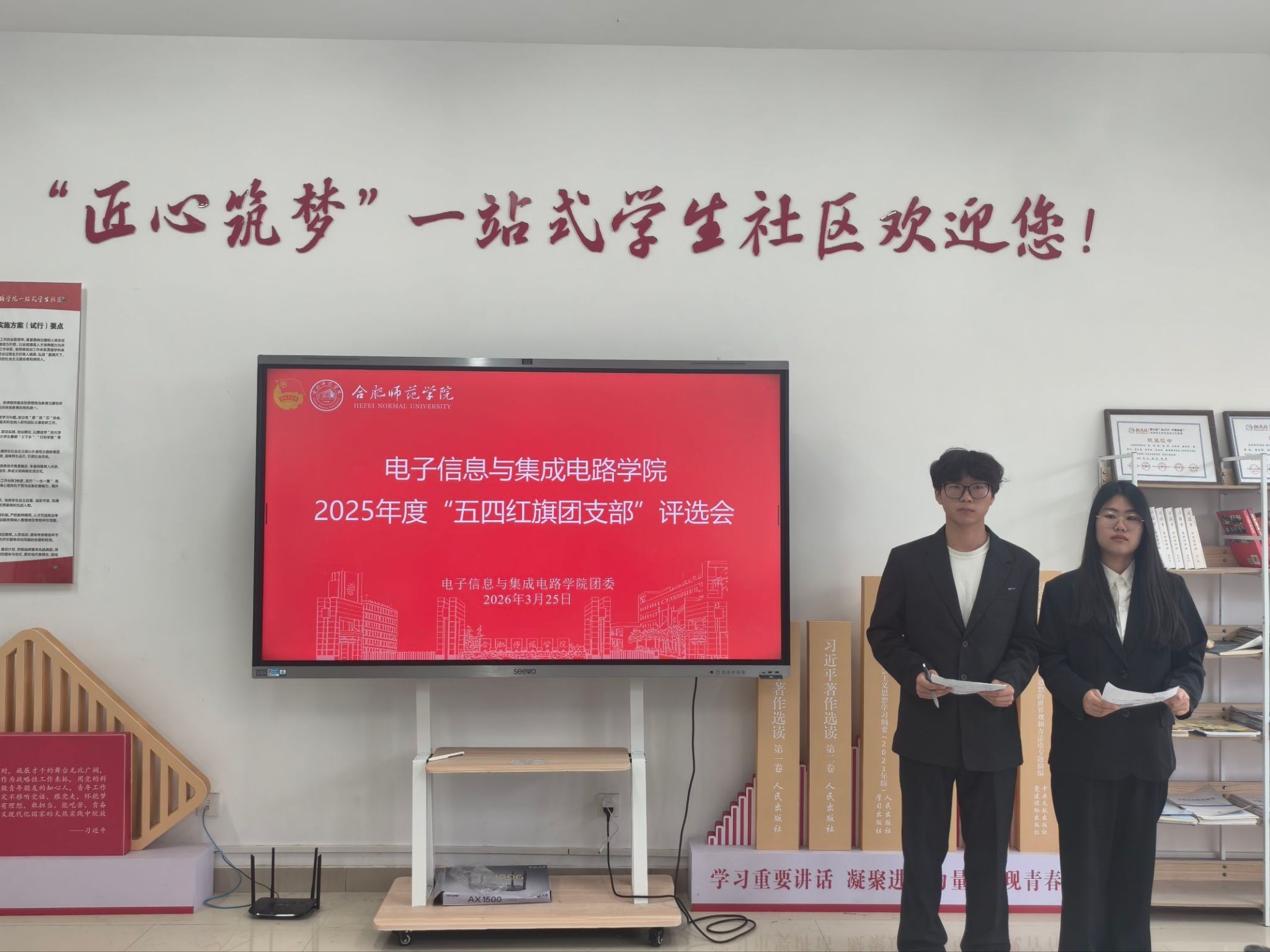 为表彰先进典型、树立青春榜样,引领全院青年团员传承五四精神、勇担时代使命,3月25日下午,电子信息与集成电路学院在“一站式”学生社区举办2025年度“五四红旗团支部”评选会,学院团委负责人、各年级辅导员担任评委,各参评团支部代表及团员代表到场参加。